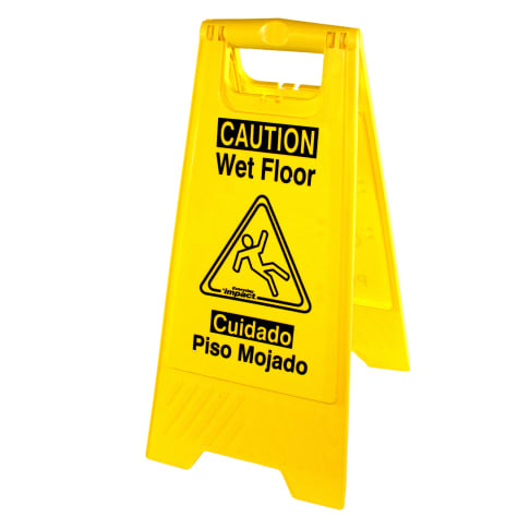This Wet Floor Sign is a great way to let people know about potential safety hazards in your business. It comes in a yellow color and is highly visible and impact-resistant. It features a ridged pattern on its feet to minimize floor contact, and it folds flat for easy storage.