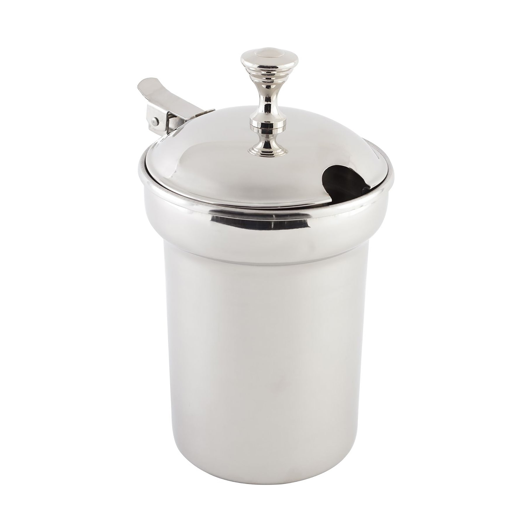 This gravy warmer insert features beautiful stainless steel construction with a chrome knob.