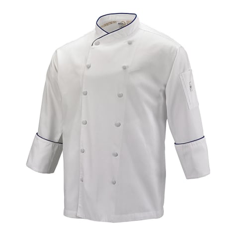 Renaissance unisex chef jackets are elegant culinary attire. These 4X‐large jackets combine comfort and durability. Made from fabrics that are easy to clean, and feature an attractive royal blue piping. CARE: Wash in warm water, not hot, and use regular detergent and color safe bleach. Dry on medium setting. Remove the garments from the dryer before they are totally dry if you prefer not to have to iron, otherwise once completely dry you can iron. This fabric blend responds well to a quick iron using the cotton setting.