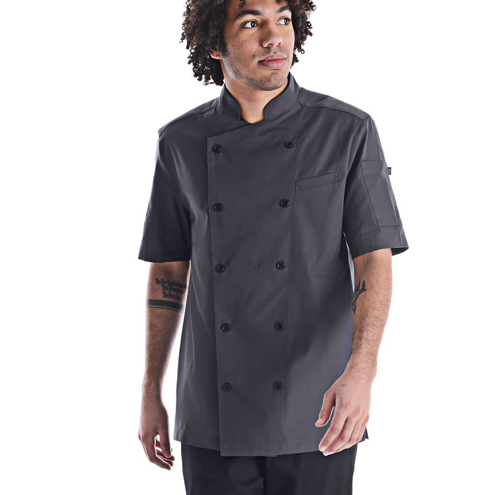 Meet your new favorite chef coat! The modern essentials line offers durable, high quality garments at an affordable price. This chef coat was designed with timeless styling, updated fit and is loaded with functional details. Engineered with pockets to hold everything you might need: thermometer, pen, phone, note pad and tweezers. It has an apron tab holder at the back neck to keep you looking tidy and professional. This lightweight, short sleeve coat will keep you cool and confident all shift long.