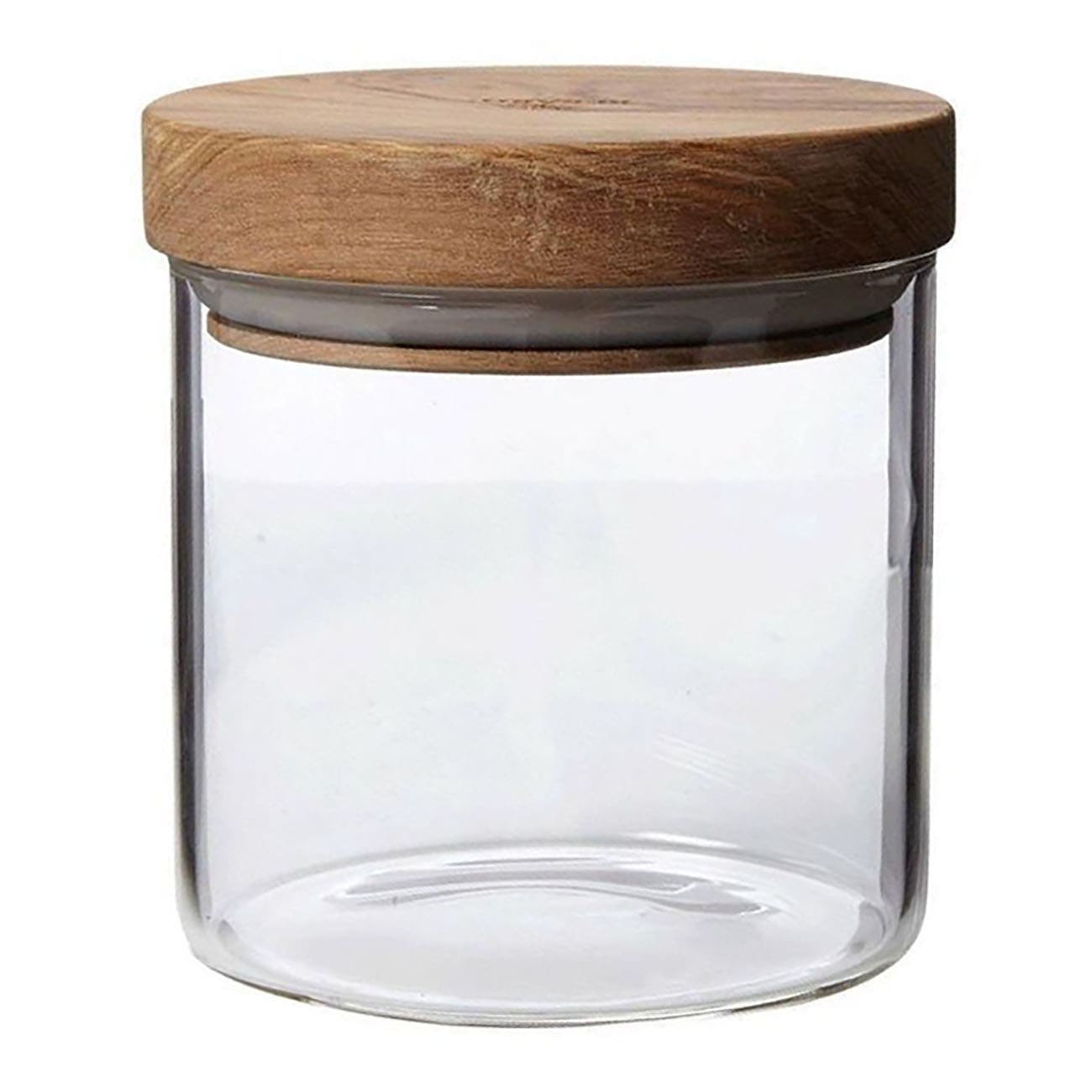 This 13.5 ounce glass storage jar features an olive wood lid and is perfect for storing a variety of smaller items. Looks great on the countertop!
