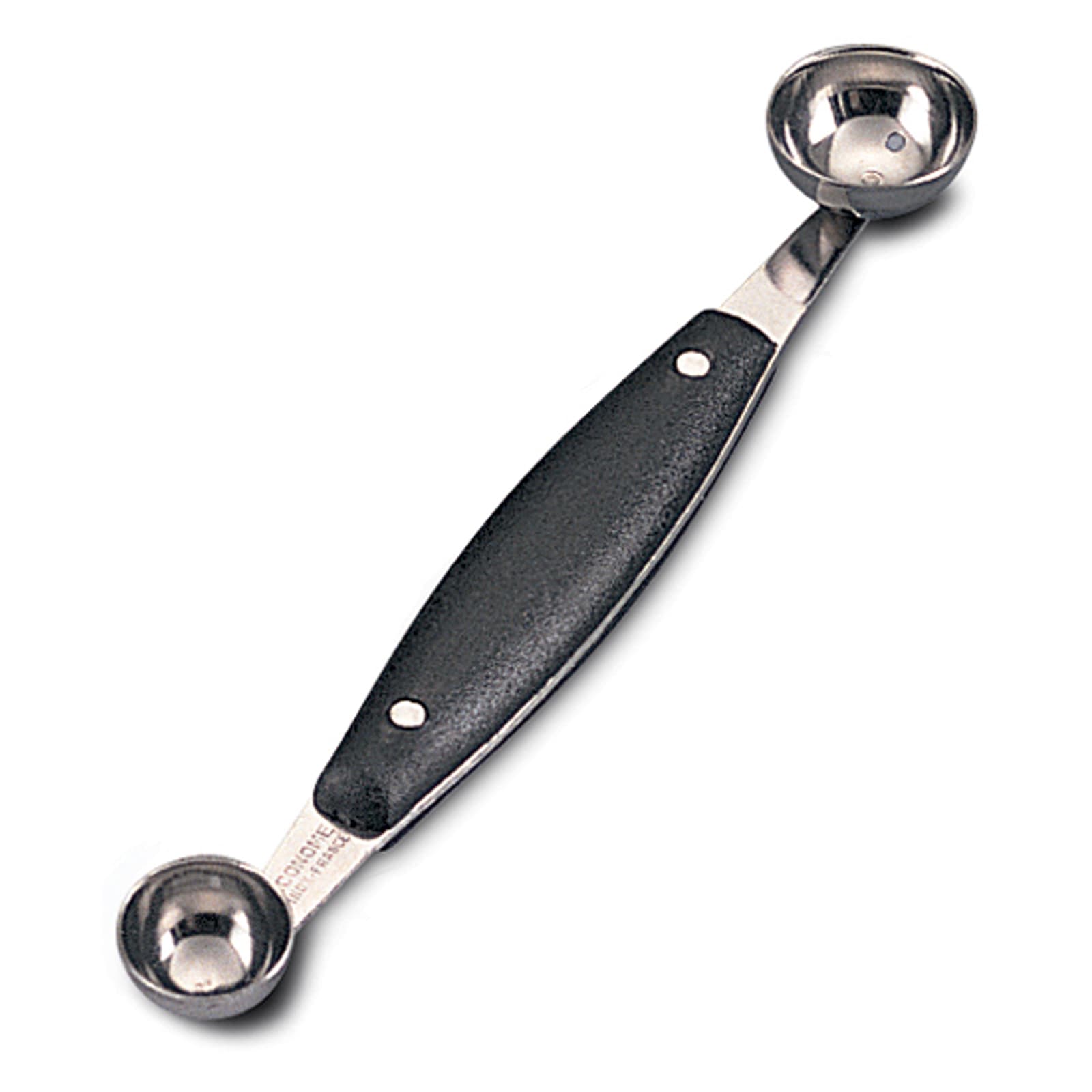 This JB Prince Double Ball Cutter is great for melons, squash, and more. It is made from durable stainless steel and has a black plastic handle.