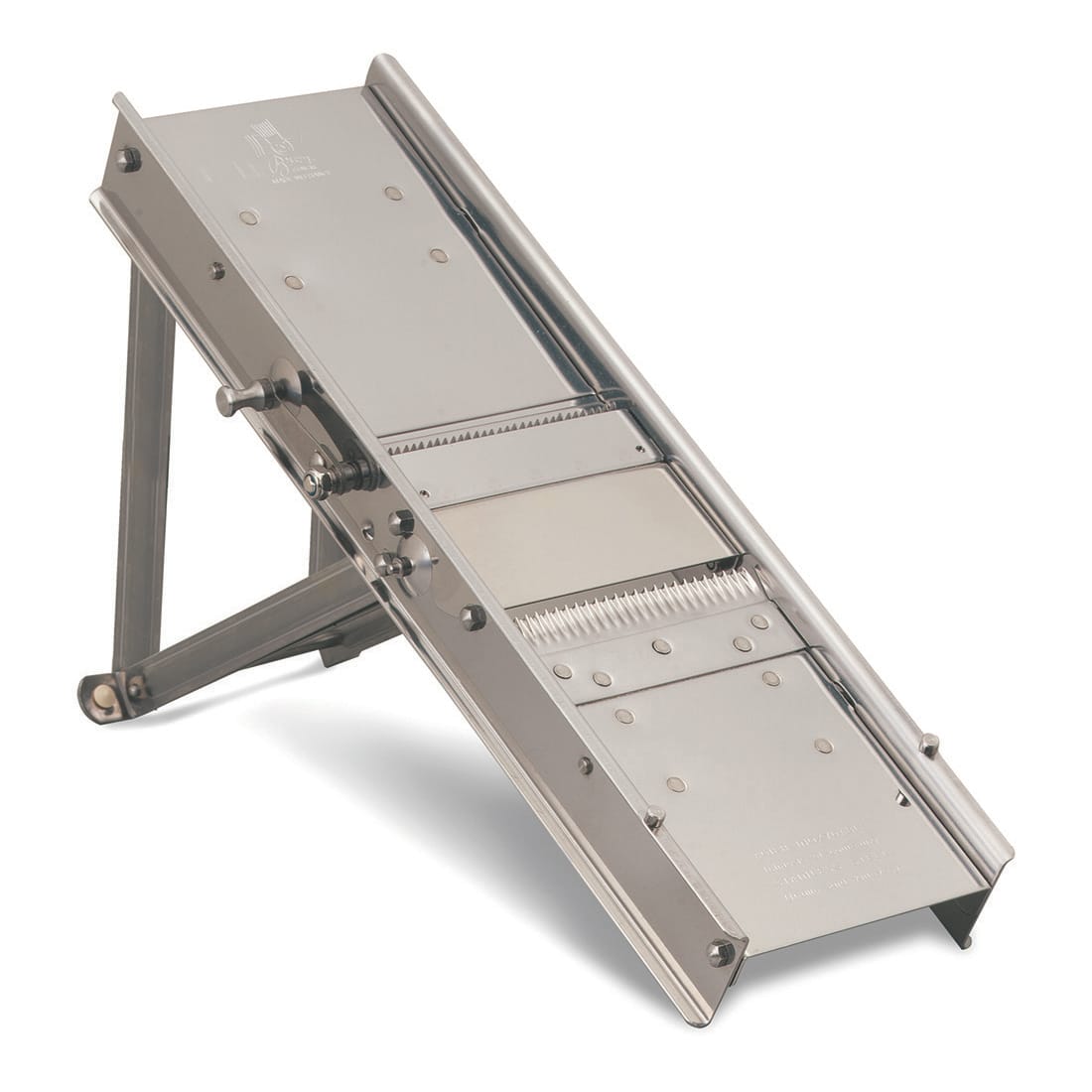 Make perfect julienne, flat, and ruffle cuts quickly and easily with the JB Prince Standard Mandoline. This mandoline has an adjustable flat and ridged blade, and features 38 blades with 1/8 and 3/8" spacing.