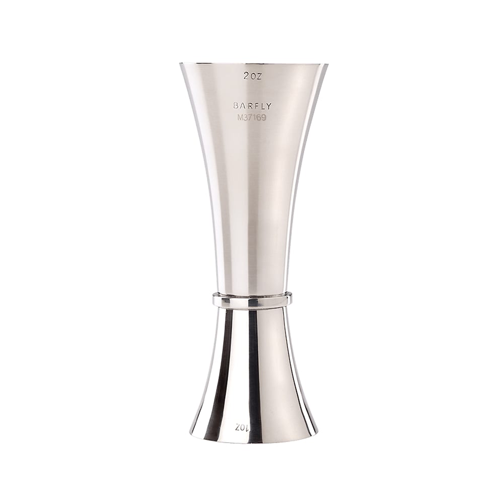 This Barfly® Yakuza Heavy Duty Jigger is a premium 1 & 2 oz. stainless steel jigger designed for precise measurements in mixology. It features internal marking lines (1/4, 1/2, 3/4, 1 1/2 oz) and a flared top edge for easy pouring, making it an essential tool for crafting perfectly balanced cocktails.