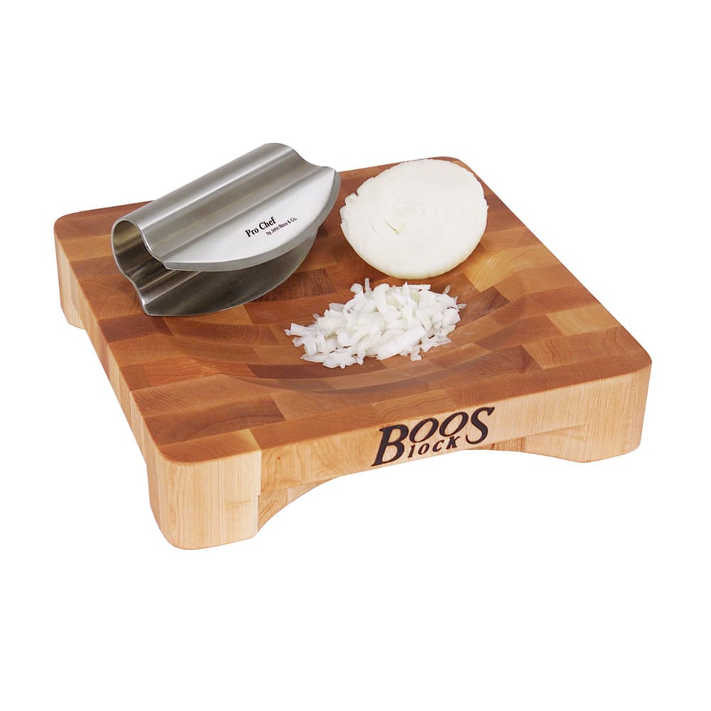 This maple herb board from John Boos is made from hard maple end grain construction and is very durable. The concave bowl rotates the product being chopped to the center of the board. board is 2" thick and is non-reversible.