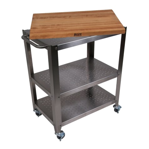 This John Boos Cucina Culinarte Kitchen Cart has a stainless steel body with a hard maple butcher block top. The butcher block is finished with Boos Block cream with beeswax. This cart has a 35" overall height and has commercial grade casters.