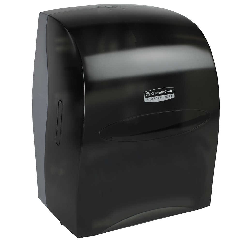 This Professional hands‐free towel dispenser is made of high impact plastic with a smoked transparent cover and gray back. It automatically dispenses a single towel when users' hand is placed beneath dispenser.