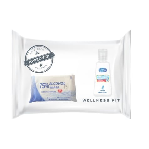 This Erwin Products kit includes a pack of 10 sanitizing wipes and a 30 ml bottle of hand sanitizer with a flip cap.