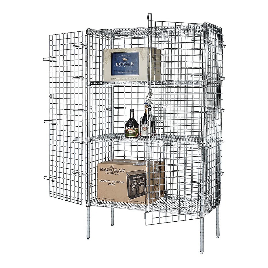 This Darling Security Cage keeps products safe from theft or damages. It features a chromate finish and includes two front panels, two side panels, two back panels, back panel assembly hardware, and top loop assembly hardware.