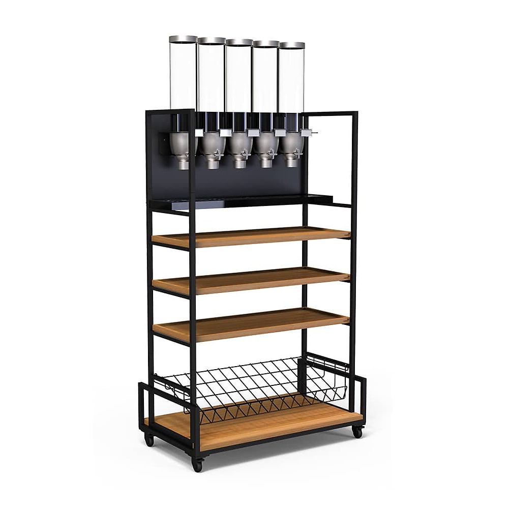 The Rosseto MC-EZS5 is a comprehensive Modulite shelving cart kit, perfect for foodservice environments. It features a sturdy black frame, three bamboo shelves, a wire basket, and five 1.3-gallon EZ-SERV containers, providing ample storage and display options. With its four rotating wheels, this cart is easily movable, making it ideal for cafes, hotels, and self-service areas.