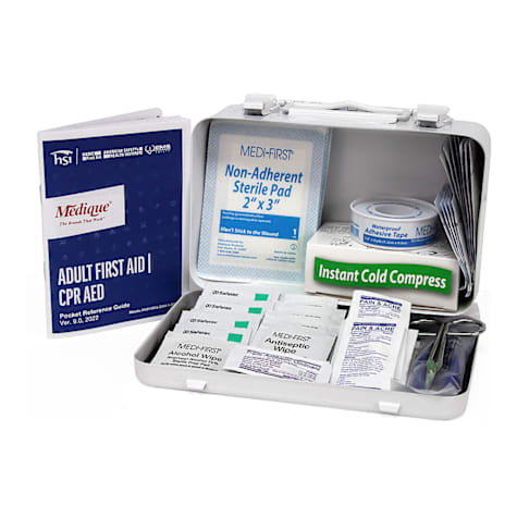 This small first aid kit includes: (1) first aid handbook english, (16)band fabric strip 1x3, (10)non‐adhesive pad ster2x3, (1)instant cold pack, (1)5yrds 1/2" first aid tape, (1)disposable tweezers, (1)wire scissors 4.5", (4)triple antibiotic, (5)pain & ache, (2)ammonia wipes, (5)antiseptic wipes, (5)alcohol wipes, (2)latex free knuckle, (2)latex free fingertip, (1) empty metal unit kit 7x4x2, (1)kit sticker small, (1)partition b, (1)partition c