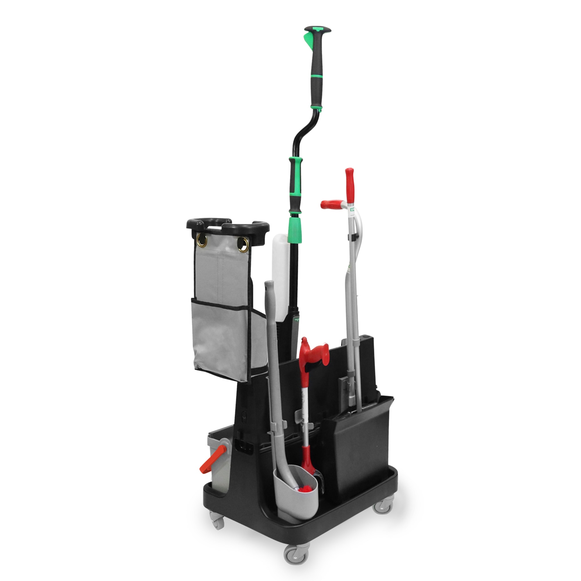 This OmniClean Restroom Kit from Unger® removes more than 90% of the dirt from the floor! With advanced design features, the OmniClean has a powerful scrub board to remove debris from the microfiber mop pad, isolating it in the dirty water bucket. The unique horizontal wringer removes remaining debris leaving you with a clean mop pad. Maximizing efficiency, the innovative dual swivel handles and adjustable height pole with bottle on board provides a constant supply of fresh cleaning agent. This kit includes: (1) Offset Pole with Actuator (1) 0.5L bottle (1) 1L bottle (1) Mop Pad Holder (2) Microfiber Pads (1) Telescopic DustPan (1) Ergo Toilet Brush Handle with 2 brush heads (1) NiftyNabber 18" red (2) SmartColor rectangular labels (1) Carriage with Wringer (1) Gray Bucket (1) Gray Bucket Scrub Board (1) Offset Tube Carriage Handle (1) Excella bottle holder clip (1) DustPan holder clip (1)Toilet Brush holder clip (1) NiftyNabber holder clip (1) Storage Caddy (1) Excella clip (4) Casters.