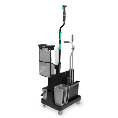 This OmniClean Spot Kit from Unger® removes more than 90% of the dirt from the floor! With advanced design features, the OmniClean has a powerful scrub board to remove debris from the microfiber mop pad, isolating it in the dirty water bucket. The unique horizontal wringer removes remaining debris leaving you with a clean mop pad. Maximizing efficiency, the innovative dual swivel handles and adjustable height pole with bottle on board provides a constant supply of fresh cleaning agent. This kit includes: (1) Offset Pole with Actuator (1) 0.5L bottle (1) 1L bottle (1) Mop Pad Holder (2) Microfiber Pads (1) Telescopic DustPan Gray (2) SmartColor rectangular labels (1) Carriage with Wringer (1) Gray Bucket (1) Gray Bucket Scrub Board (1) Gray Bucket Handle (1) Offset Tube Carriage Handle (1) Excella bottle holder clip (1) DustPan holder clip (2) Storage Bins (1) Storage Caddy (1) Excella clip (4) Casters.