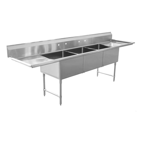 This 16G Heavy Duty 3-Compartment Sink delivers exceptional strength and capacity. Made from 16-gauge stainless steel, it features three oversized 24" x 24" bowls that easily accommodate large cookware and support efficient wash, rinse, and sanitize cycles. Two 24" drainboards provide generous space for drying and staging, helping keep workflows smooth and organized. Built to withstand constant use, this sink is a reliable, heavy-duty solution for professional foodservice environments.