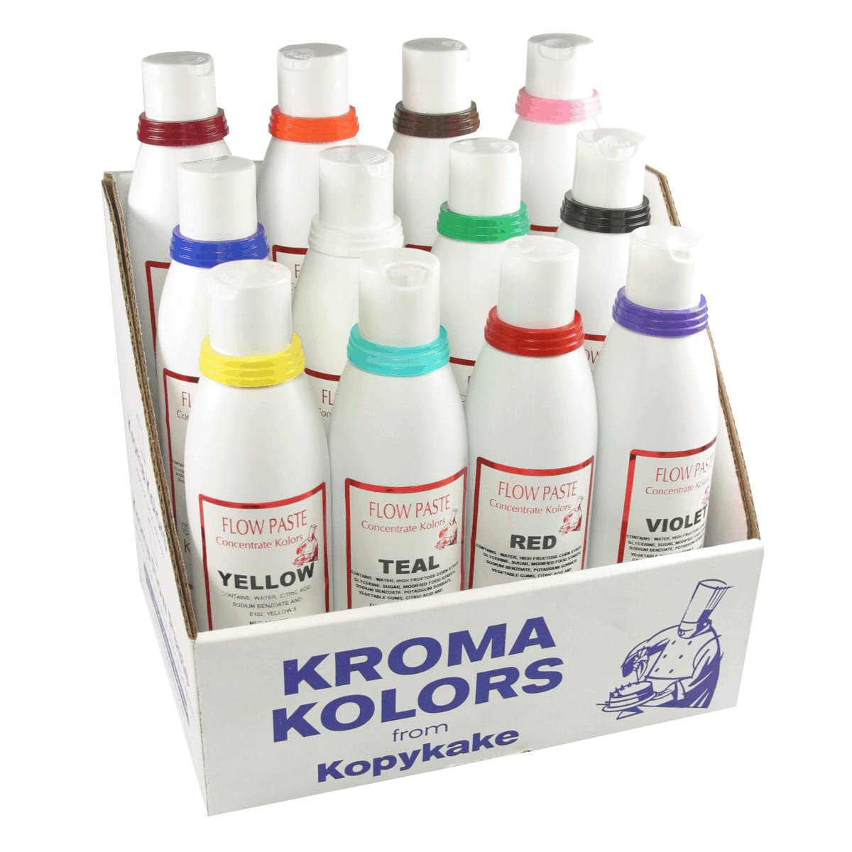 This Kopykake Kroma Flow Paste set contains 9 oz bottles, with 12 different colors. Colors included are black, blue, brown, burgundy, green, orange, pink, red, violet, yellow, teal and white. Just mix 1 or 2 drops to your icing to get the desired color.