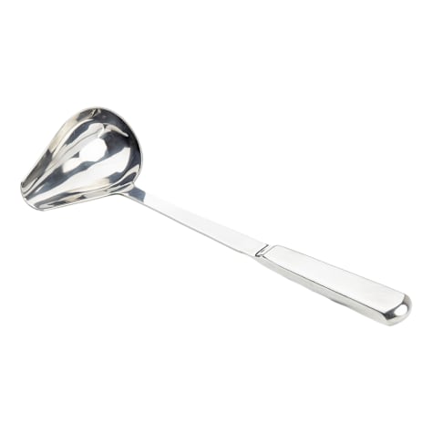 This small ladle from the Holden Collection™ features a 1-ounce capacity and is equipped with a convenient spout for precise pouring. Measuring 11.75 inches in length, it is crafted from 18/0 stainless steel, ensuring durability. The hollow handle provides a comfortable grip, making it ideal for both home and professional kitchens.