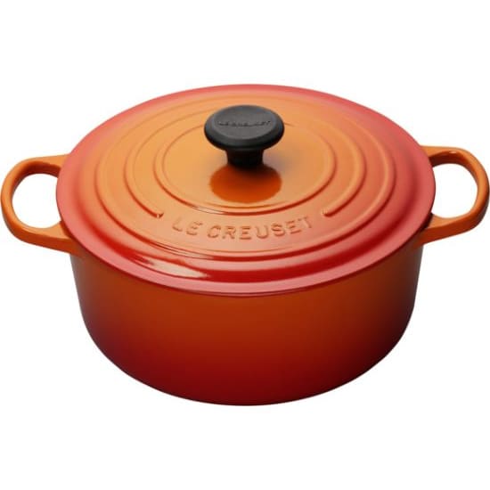 This Le Creuset Round French Oven has a 5.5 Qt. capacity and is made from cast iron. It has a Flame exterior, and a sand-colored interior. This oven can be used with a variety of heat sources, and is dishwasher safe. It comes with a limited lifetime warranty.