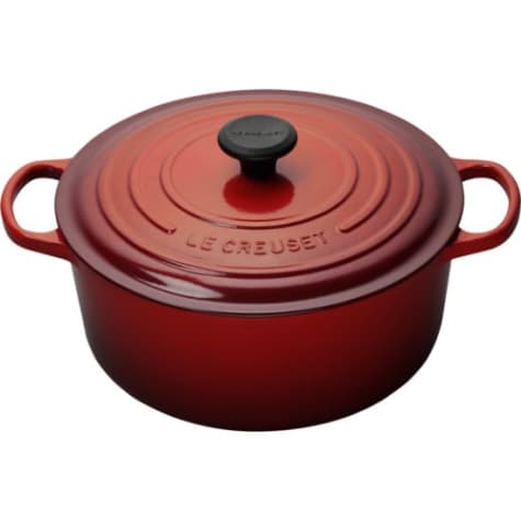 This Le Creuset Round French Oven has a 7.25 Qt. capacity and is made from cast iron. It can be used with a variety of heat sources, and includes a lid with a knob that is heat-resistant to 500°F. This oven is a Cherry color and has a sand colored interior. It is dishwasher safe and has a limited lifetime warranty.