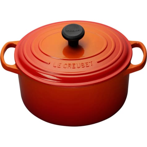 This Le Creuset Oval French Oven has a 5 Qt. capacity and is made from cast iron. It has a Flame colored exterior and a sand colored interior. It can be used with a variety of heat sources and is dishwasher safe. It has a limited lifetime warranty.