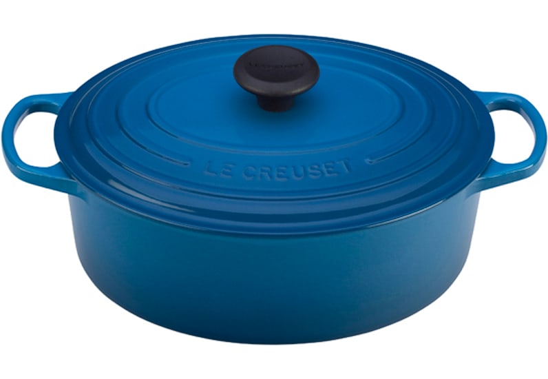 This Le Creuset Oval French Oven is made from cast iron and has a Marseille colored exterior and a sand colored interior. It has a 5 Qt. capacity and can be used with a variety of heat sources. It is dishwasher safe and has a limited lifetime warranty.