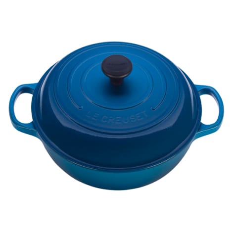 This Le Creuset Braiser is made from cast iron and has a Marseille colored exterior and a sand colored interior. It has a 3.5 Qt. capacity and can be used with a variety of heat sources. It is dishwasher safe and has a limited lifetime warranty.