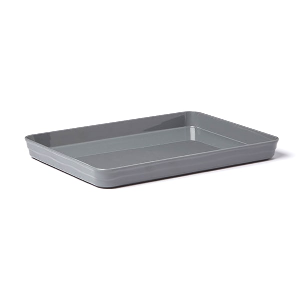 This 11-3/8-inch by 8-3/8-inch rectangular serving tray in gray is designed for both functionality and style. Part of the Del Mar Collection, it serves as a lid for compatible bowls or as a standalone tray. Made from ABS plastic, it features a stackable design for easy storage and transport, making it ideal for outdoor and catered events.