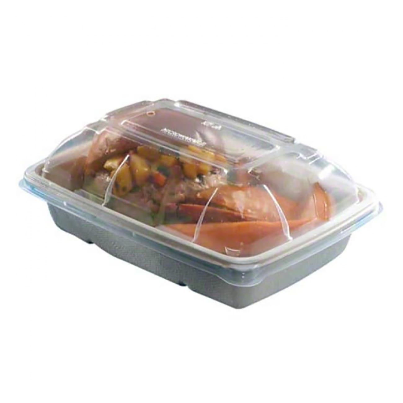 This recyclable plastic lid from Sabert is for use with their molded fiber pulp container base.