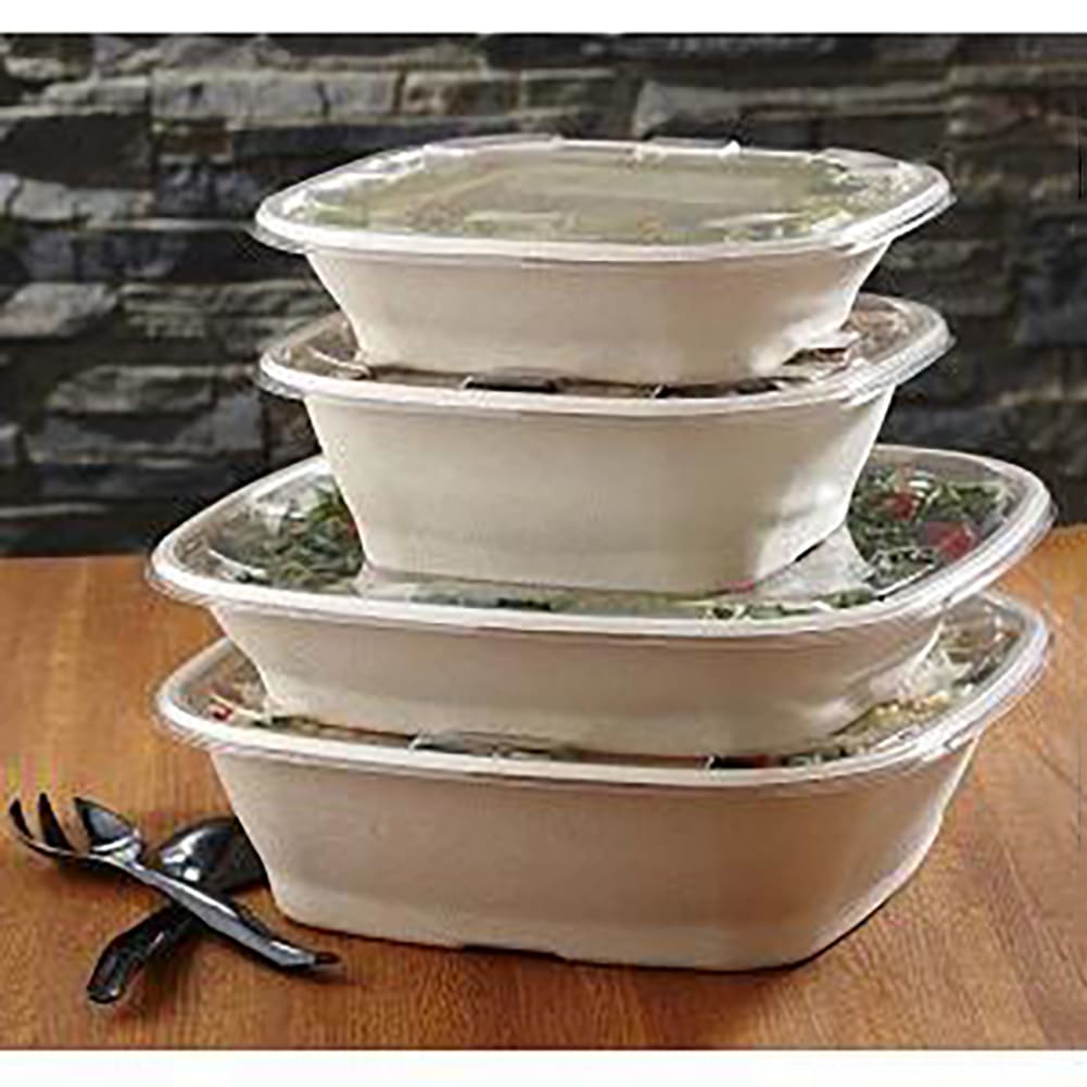 Sabert's recyclable PET splash proof lid fits the 160 ounce square paper bowl (Model 42141600D25) and 240 ounce square paper bowl ( 42142400D25).