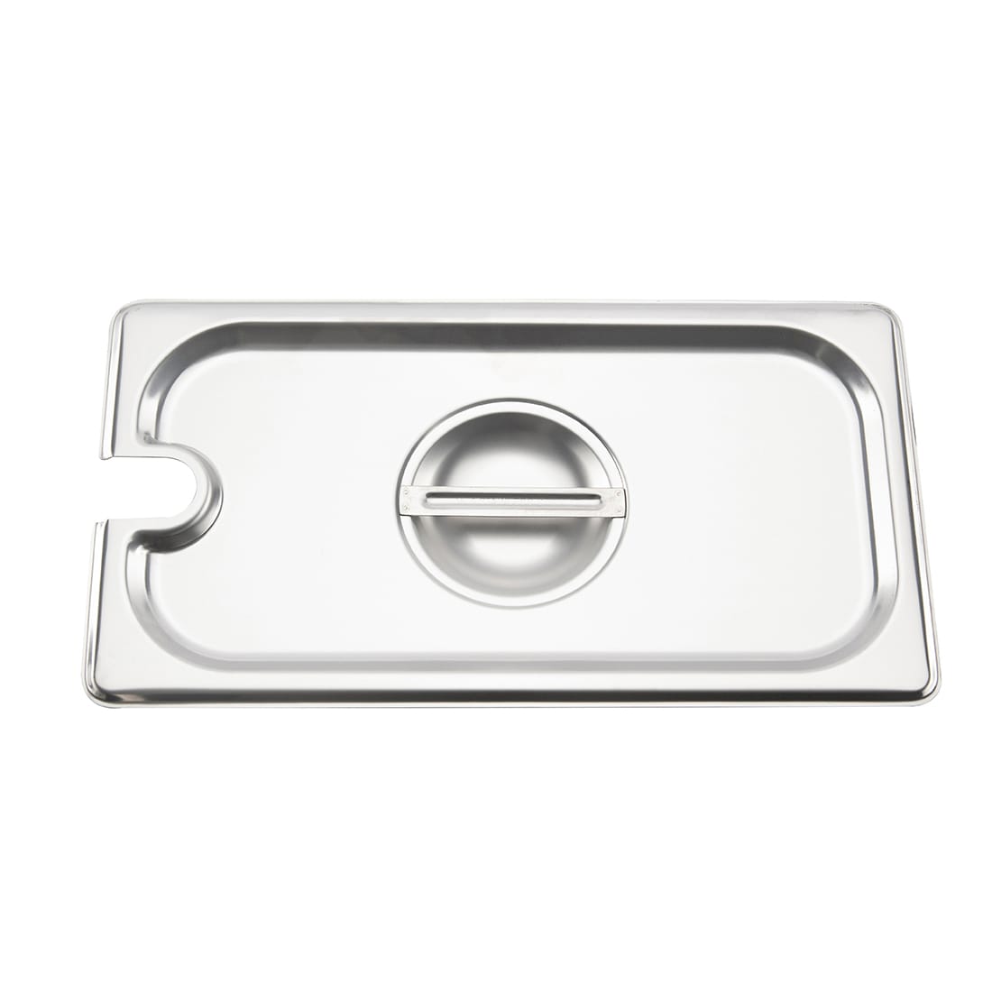 This 1/3 size steam table pan cover from Browne Foodservice features stainless steel construction and helps prevent seepage or spills during transport.