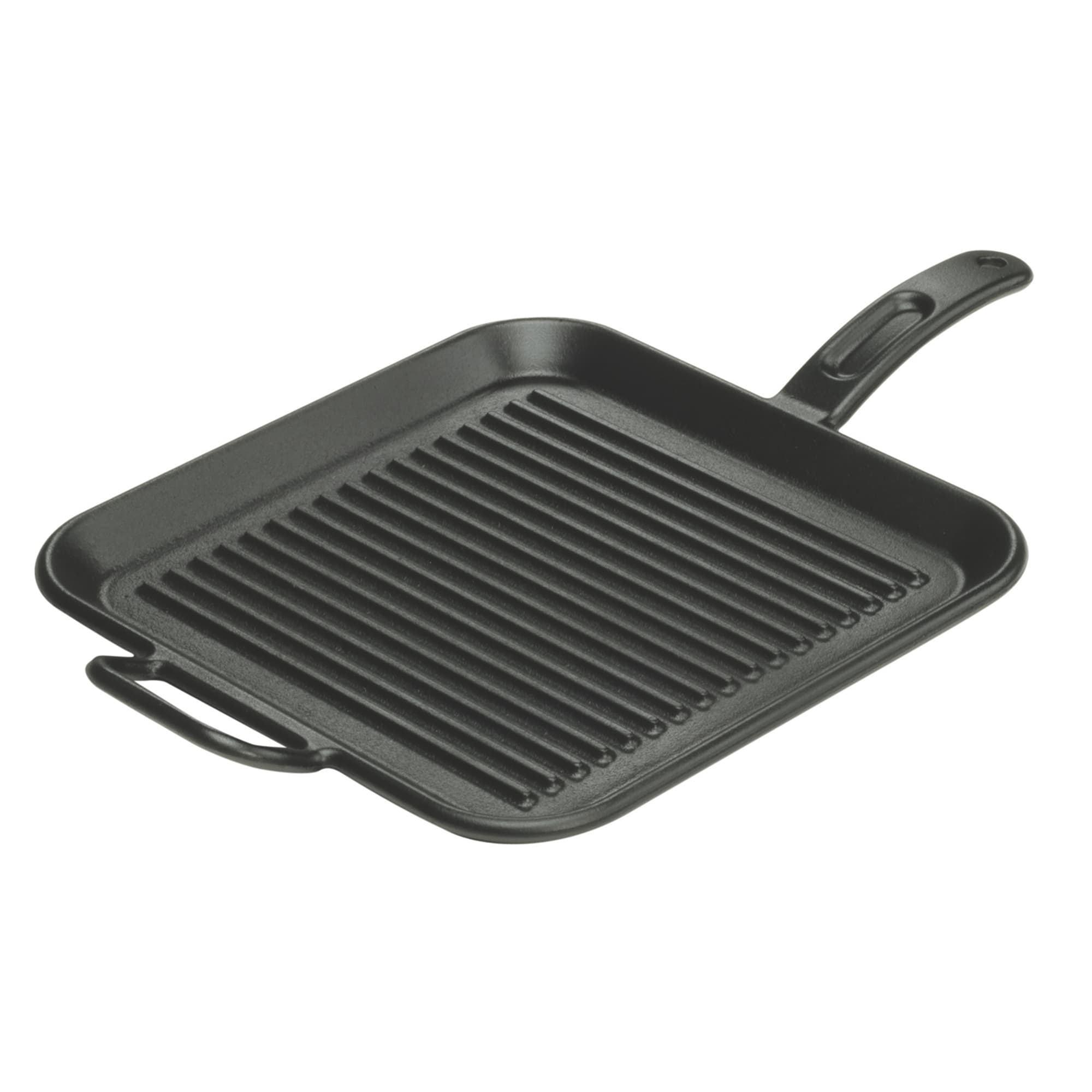 This Pro‐Logic square cast iron grill pan has low, slanted sides to make flipping easy and the raised ridges help remove fat from food. There is a long handle with a hole for hanging and a helper handle to make transferring the pan easy.
