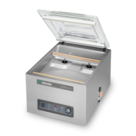 This vacuum packaging machine from Henkelman is equipped for professional usage and is great for first time packaging experiences. The robust, stainless steel JUMBO 42XL vacuum packaging machine is standard equipped with a Busch vacuum pump and Time control with a 1 program memory.