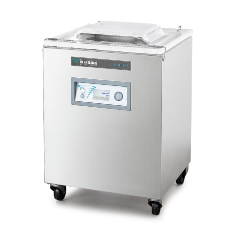 This floor-standing vacuum packaging machine from Henkelman is designed for high-volume food storage and sous-vide cooking. The Marlin 52II features two removable 20.5-inch seal bars, allowing for efficient sealing of multiple products simultaneously. Equipped with a powerful 2,780 cft/h Busch vacuum pump, it ensures consistent and reliable vacuuming. The COMBIVAC™ sensor controls offer 20 program presets, optimizing the packaging process for different applications. Its transparent automatic lid provides visibility during operation, while the stainless steel construction ensures durability in commercial kitchens. Additional features include Soft Air technology to protect delicate items, a USB port for data storage, and a pump maintenance cycle for long-term performance.
