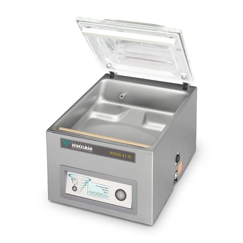 This Henkelman Boxer 42XL CombiVac is a versatile tabletop vacuum packaging machine designed for commercial use. It features a spacious vacuum chamber, allowing it to accommodate larger products up to 18" in length. Equipped with a powerful vacuum pump and a 10-program sensor control panel, the Boxer 42XL ensures precise and efficient vacuum sealing. The machine also includes soft air for delicate products, a second seal bar option for increased productivity, and a robust stainless steel construction for easy cleaning and durability. Ideal for busy kitchens, butcher shops, and other commercial settings, the Boxer 42XL offers reliable performance and customizable options to meet various packaging needs.