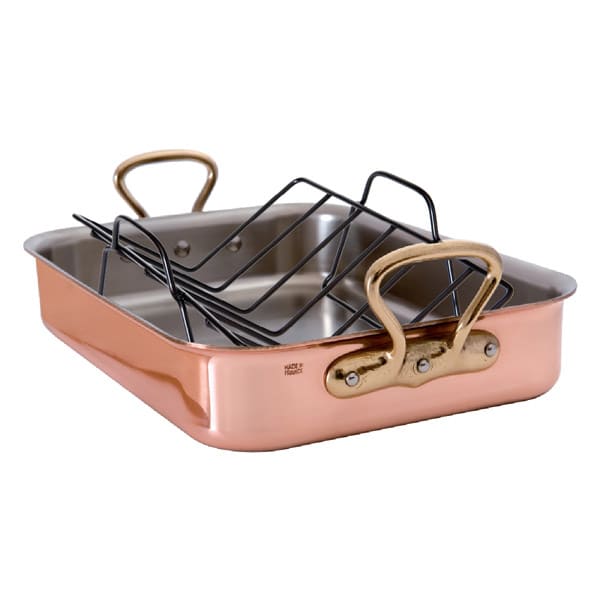 This Mauviel M'Heritage Tri-Ply Roaster is a 15.7" x 11.8" size. It has a polished copper exterior and also features 18/10 stainless steel and aluminum. This roaster is oven safe and has a lifetime warranty.
