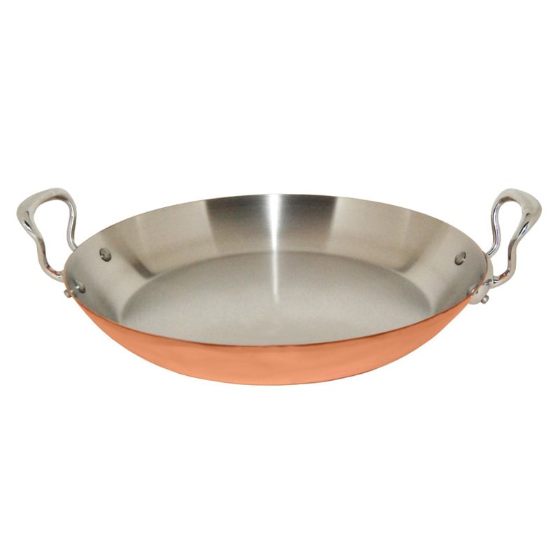 This Mauviel M'Heritage Paella Pan is a 13.7" size and has a polished copper exterior and stainless steel interior. It is finished with cast stainless steel handles attached with stainless steel rivets.