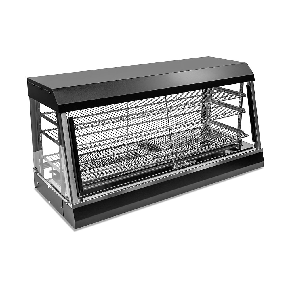 This Vollrath hot food merchandiser provides a great way to display a variety of foods, all while keeping them warm and ready to eat. This merchandiser features an adjustable heat control to ensure the perfect serving temperatures. The three tiered, adjustable shelves showcase your products for quick sales. The sliding, lockable doors on both the front and rear allow for easy restocking and designed for self‐service.