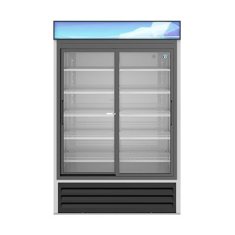 This 2-section glass door merchandiser from Hoshizaki features self-closing sliding doors with spring assist and stay-open features. The large glass doors are energy efficient Low-E multi pane glass and the energy efficient vertical LED interior lights illuminate products on display.