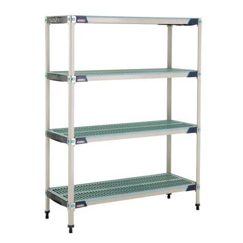 This MetroMax i 18" x 48" x 63" starter shelving unit from Metro comes with four open shelves and posts. These shelving units are easy to clean and easy to assemble. Antimicrobial properties are built in to inhibit the growth of bacteria that may affect this product. The antimicrobial properties do not protect users or others against bacteria, viruses, germs, or other disease organisms. Always clean and wash this product thoroughly before and after each use.