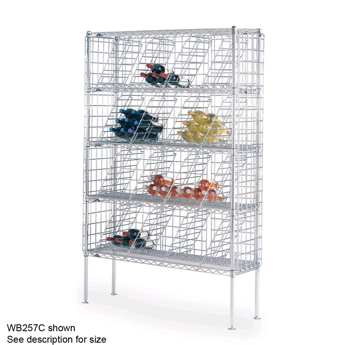This Super Erecta 14" x 36" bulk storage wine shelving from Metro stores wine securely and holds the bottles at the proper angle. This unit permits storage of a large quantity of wines in a limited space ‐ an average of one case per linear foot of shelf. The open wire construction permits air flow which is critical in maintaining the proper temperature. This durable wine shelving unit features posts that are fitted with triangular foot plates which bolt the units to the floor for greater stability. This unit features a chrome‐plated finish and is 74‐3/4" high.