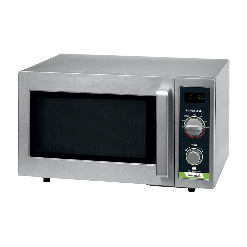 This Winco Spectrum™ Commercial-Grade Microwave Oven offers a .9 cubic foot capacity and delivers 1,000 watts of cooking performance - ideal for quick-serve restaurants, concession stands, and more. Crafted with an easy-clean stainless steel exterior and interior, this microwave features a bottom antenna for efficient energy distribution and even heating. Its dial operation allows quick adjustments to power levels and cooking time, making it a reliable choice for commercial food service environments.