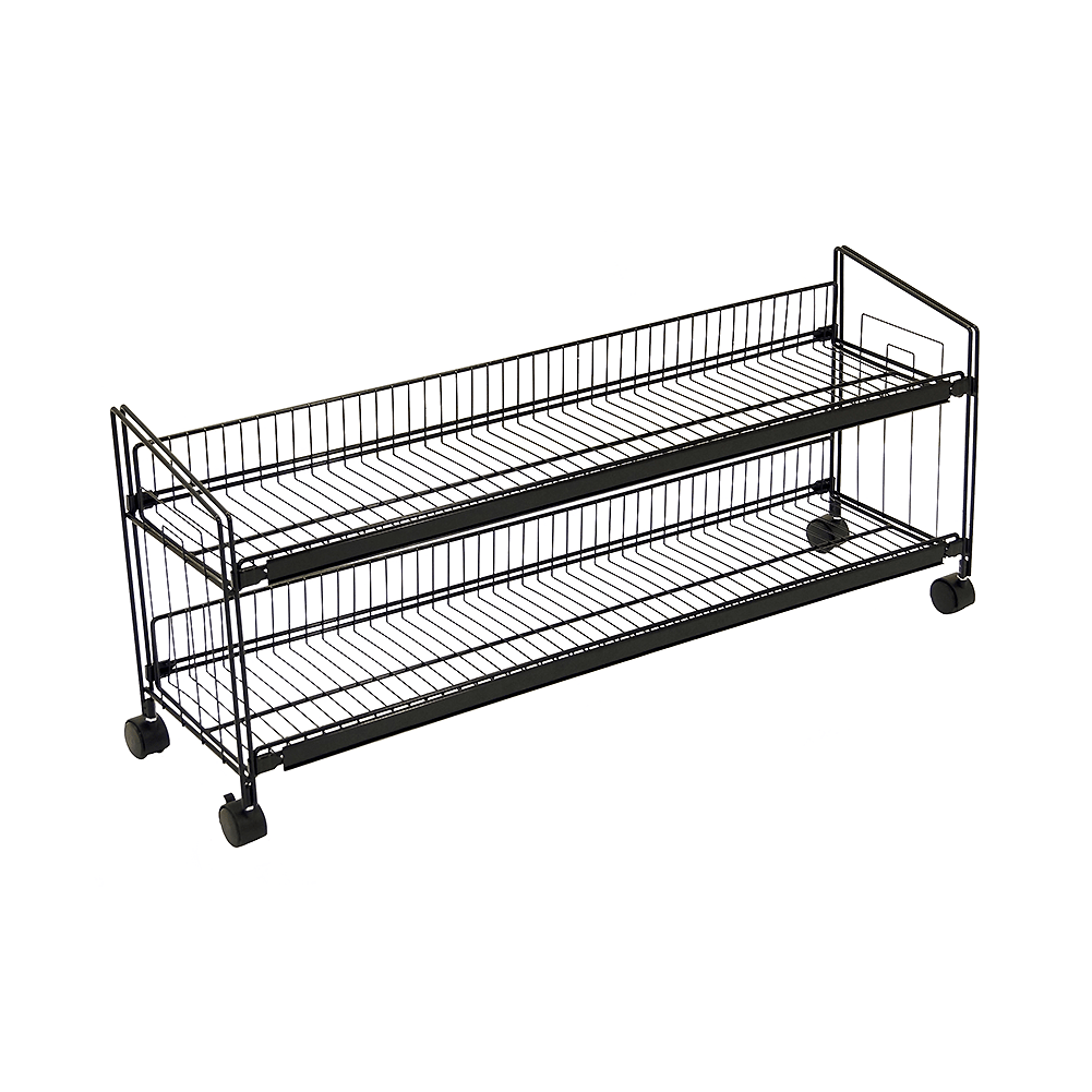 This Mobile Merchandisers® Knee Knocker Display Rack has a two bay design and includes two shelves. It is made from wire and is a 57" x 20" x 12" size.