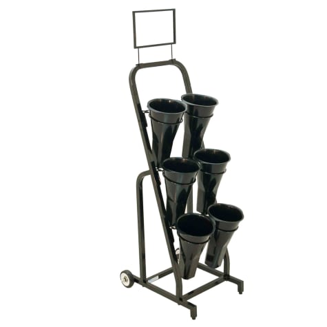 This Mobile Merchandisers® Floral Display Rack is made from tube steel frames and wire and is a black color. It includes six vases, perfect for displaying fresh flowers for purchase.