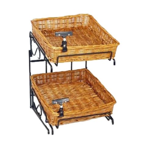 This Mobile Merchandisers® Display Rack has a 2-tier design and is ideal for displaying a variety of items on counters. It is made from black wire and tube steel and includes two willow baskets.