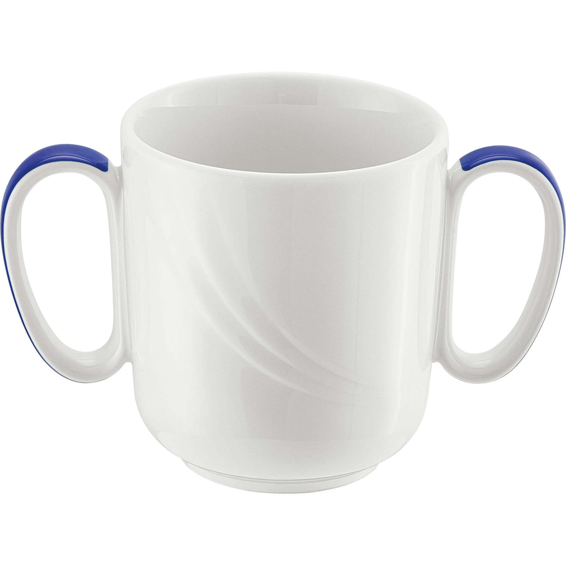 This Donna Senior 10.5 ounce mug has a unique 2‐handled design with blue bands that makes dining easier for people with reduced vision, mobility and motor skills ‐ without calling attention