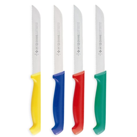 This box of assorted utility knives from Mundial® features a serra sharp double action bar and bread pointed tip. This 12 piece set includes 3 each of green, yellow, blue and red handled knives.