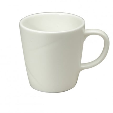 This tall cup from Vision Undecorated will not only please your guests, it will become a favorite of yours. The warm white bone china has a distinguished design of three arcs traversing the wide sloping rim.