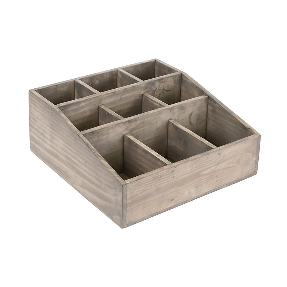 The Cal-Mil 1714-110 is a chic and functional condiment organizer from the Aspen collection. Crafted from durable gray-washed pine wood, this organizer features nine compartments designed to hold sugar packets, creamers, stir sticks, and other essentials. Measuring 12" W x 12" D x 5.5" H, its subtly tiered structure ensures easy access and visibility, making it perfect for coffee stations, bakeries, and buffets.
