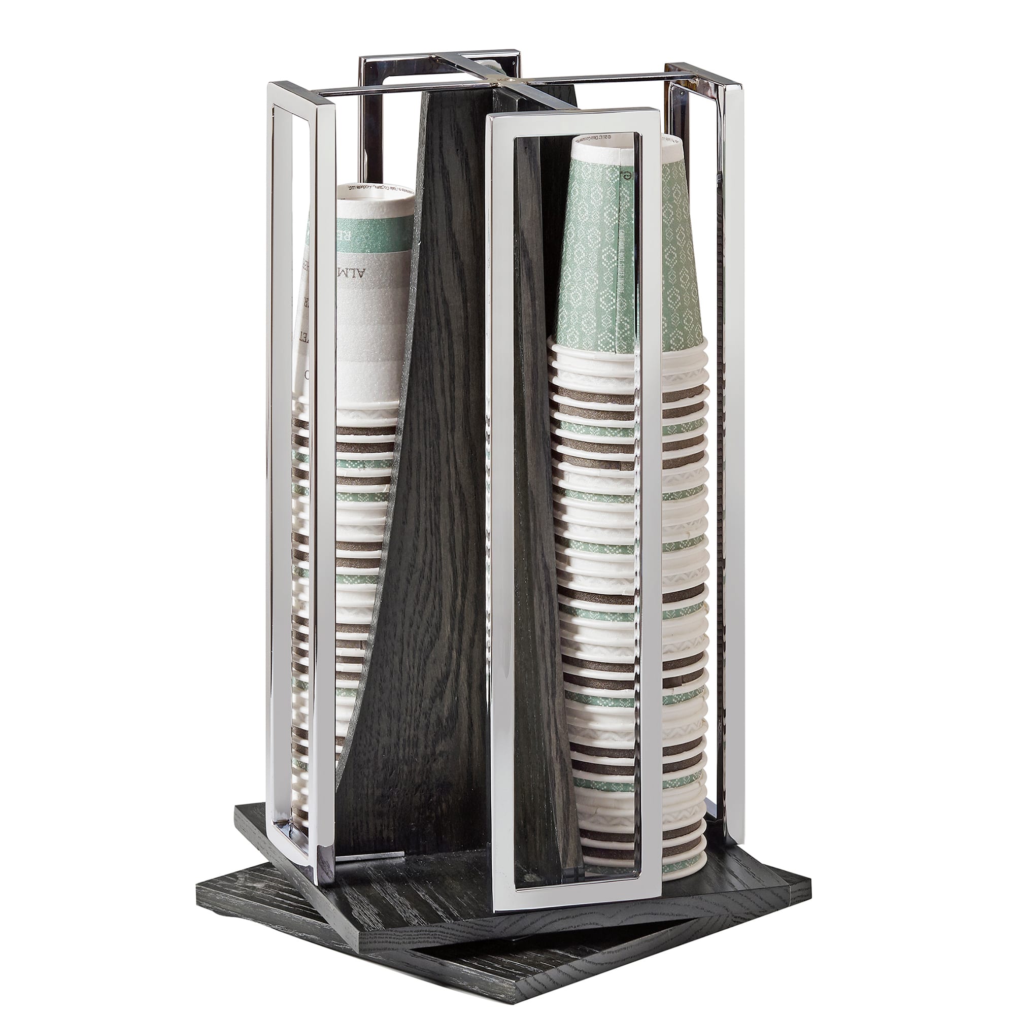 This Cinderwood Revolving Cup and Lid Organizer from Cal‐Mi is made from beautiful mirrored metal and gray‐stained oak. It holds cups and lids up to 3.75" in diameter and the revolving function allows customers to grab from all angles.