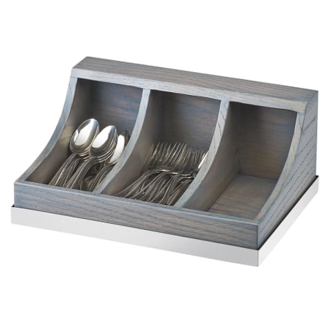 This flatware organizer from Cal‐Mil is part of the Ashwood Collection and is made from durable gray‐stained oak. The open‐faced front allows customers to easily locate where their desired utensil is and the gentle curves contrast with the mirrored square accent to create a modern and elegant piece.