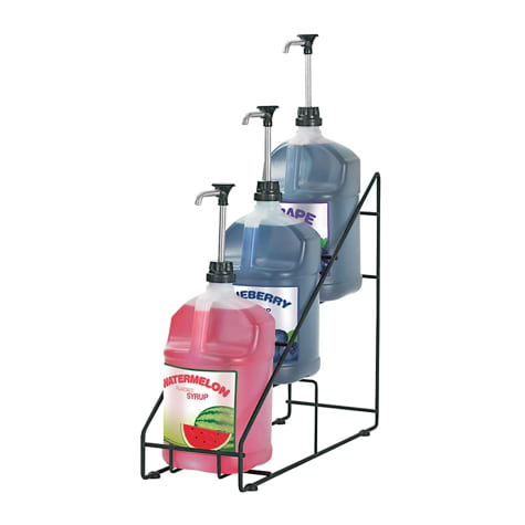 The Server 88654 WireWise™ jug organizer holds three 1‐gallon syrup flavor jugs. This organizer is lightweight, yet has a durable wire‐frame construction and four non‐skid rubber feet to keep it from sliding. It will add a sleek touch to coffee shops, ice cream bars, or any self serve counter.